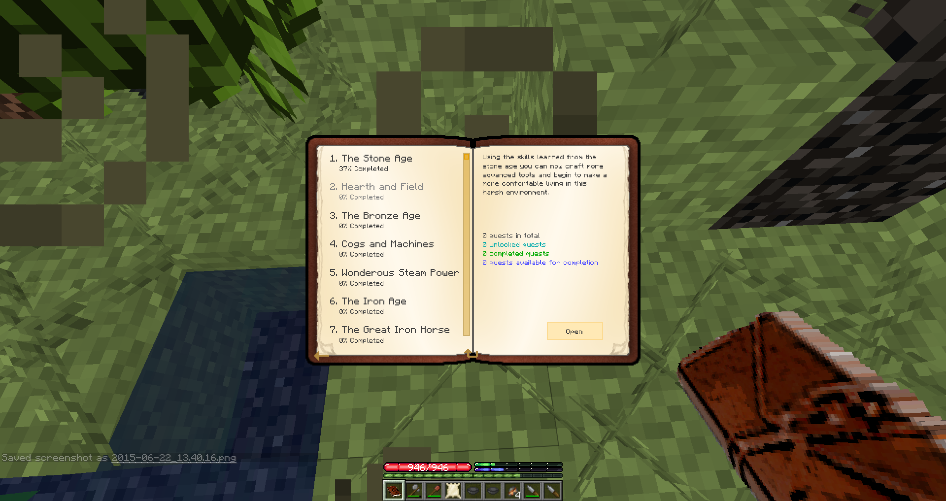 when u finish some quests in the stone age quests in hearth and field unlocks then bronze age unlocks if u finish some of hearth and field quests thats how the quests work....... so start working!Loving the pack, its well thought out and and very fun. I am however having a problem with my quest book, the only quest-sections with quests inside of them are "the stone age" and "Tech Tree Diagram (optional)" and the other sections are empty. it isnt game breaking but i would have liked to follow on the quests. Is there a solution?