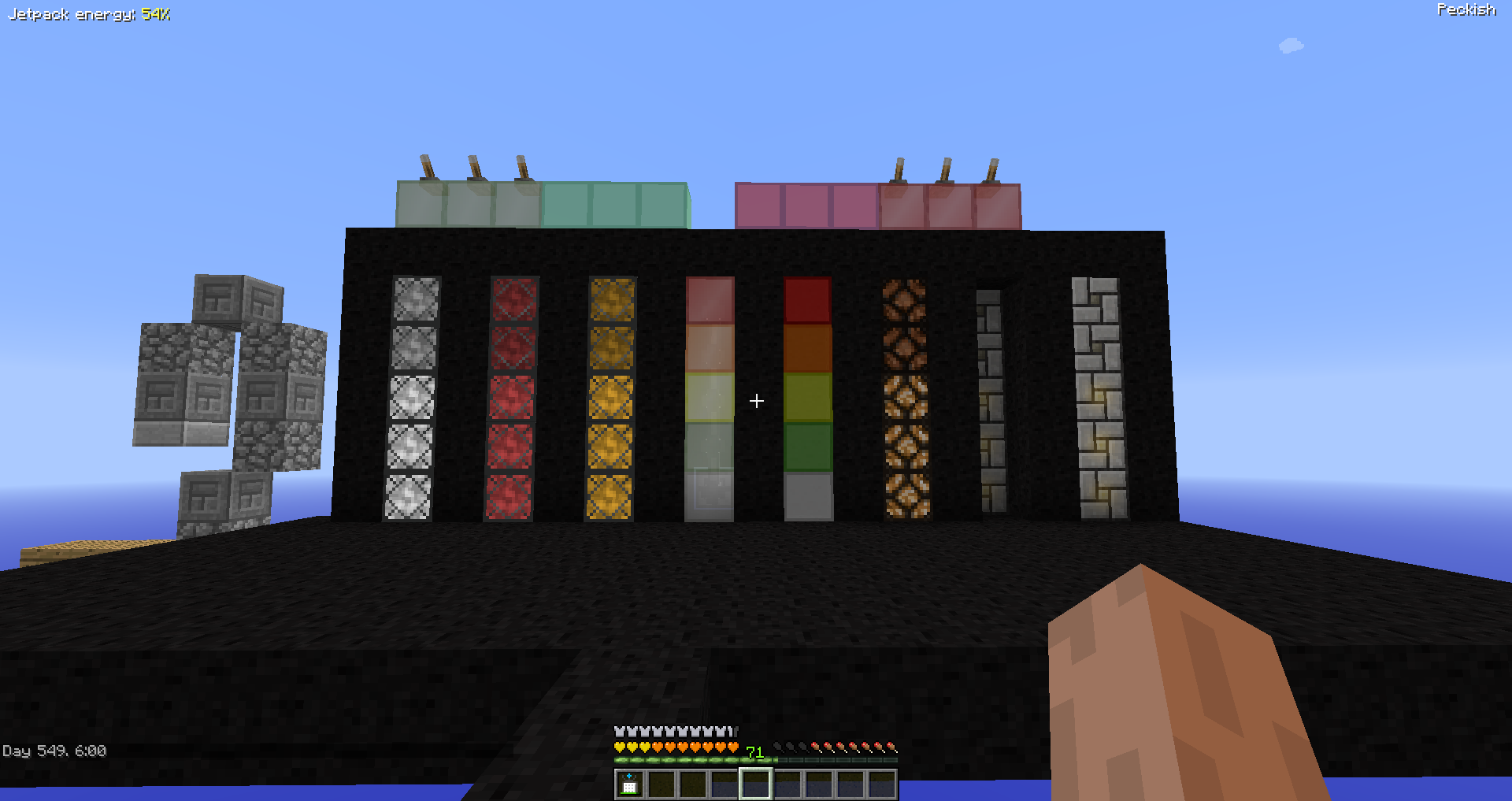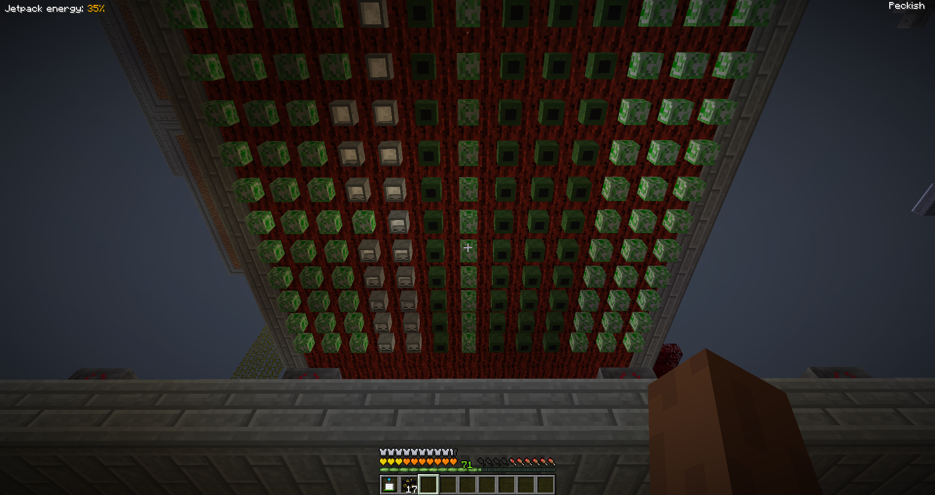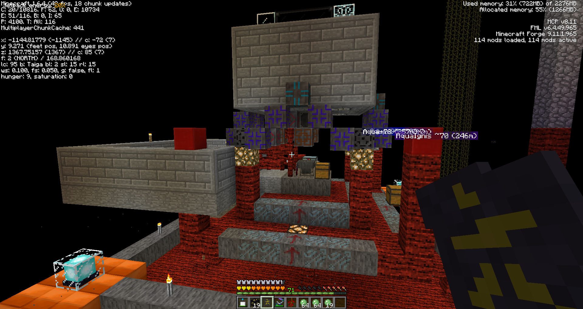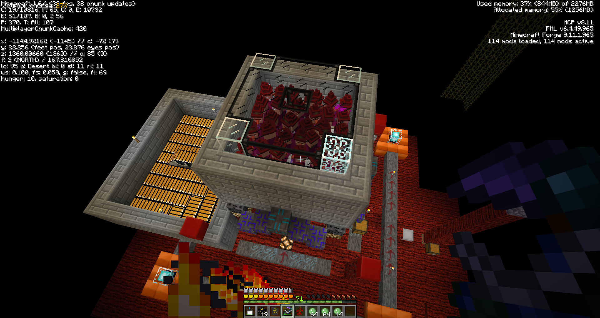 Also, bonus pics. You mention your idiot spawn and sacrifice area. For ongoing LP filling, consider a witch room. As pictured below, I have my original conveyor-belted villager spawning area for quick fills if necessary, but also a 51 witch jail right on top of my well of suffering. Probably overkill, especially as I haven't lost one yet thanks to their drinking problem, but it gets me plenty of LP to make a constant supply of slates, sockets, or keep my orbs filled. With 14 runes of sacrifice and 34 speed runs, it'll run continuously making Demonic Slates, topping up in the middle of each one. 1200LP to the altar per "hit" of the well. Actually just tested, and it'll fill blood sockets too without villager sacrifice. They run the altar dry, and I see grey sparkles, but after ~20secs, I still end up with a filled socket. Guess I don't need my villager auto-spawner anymore!