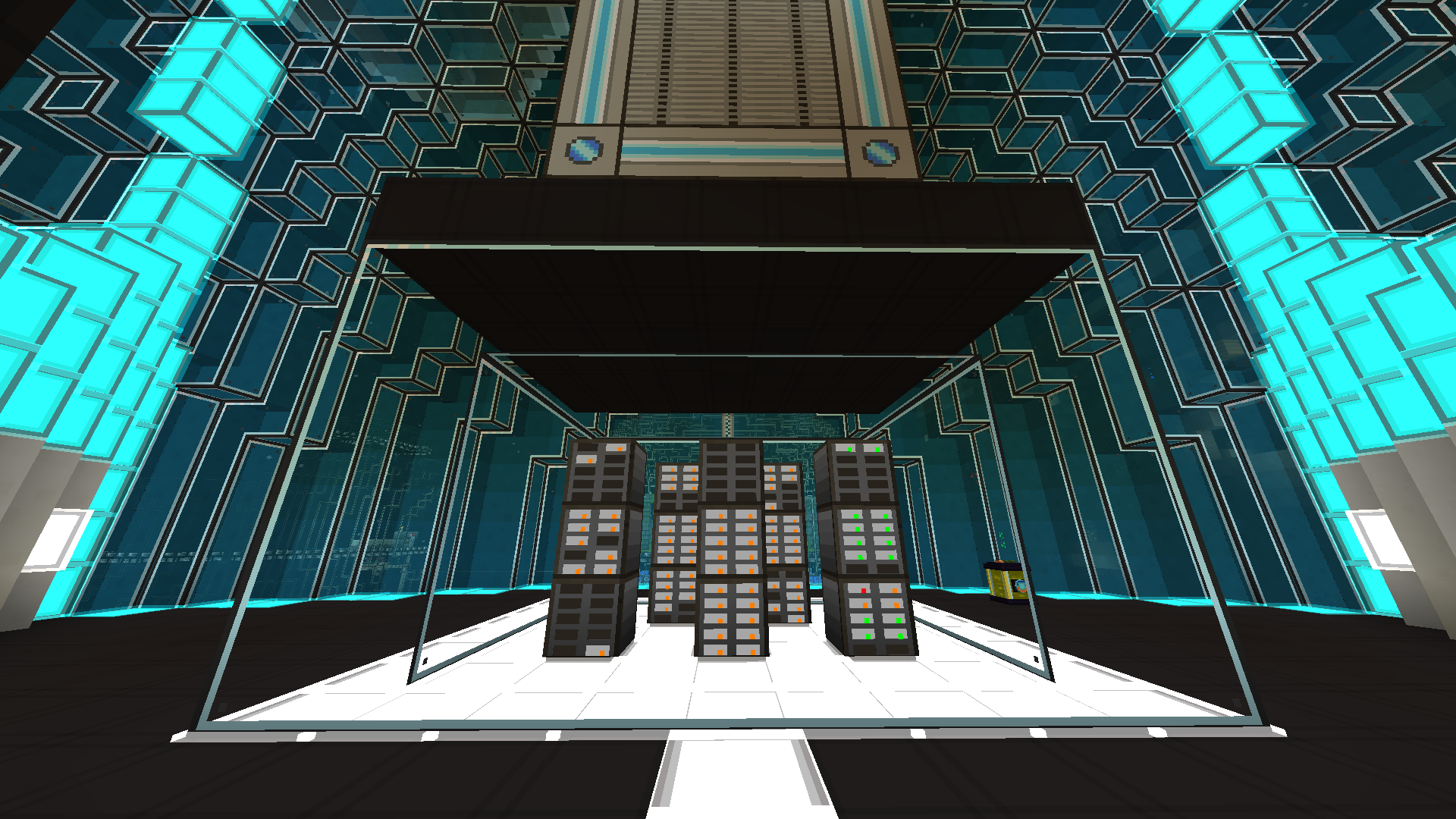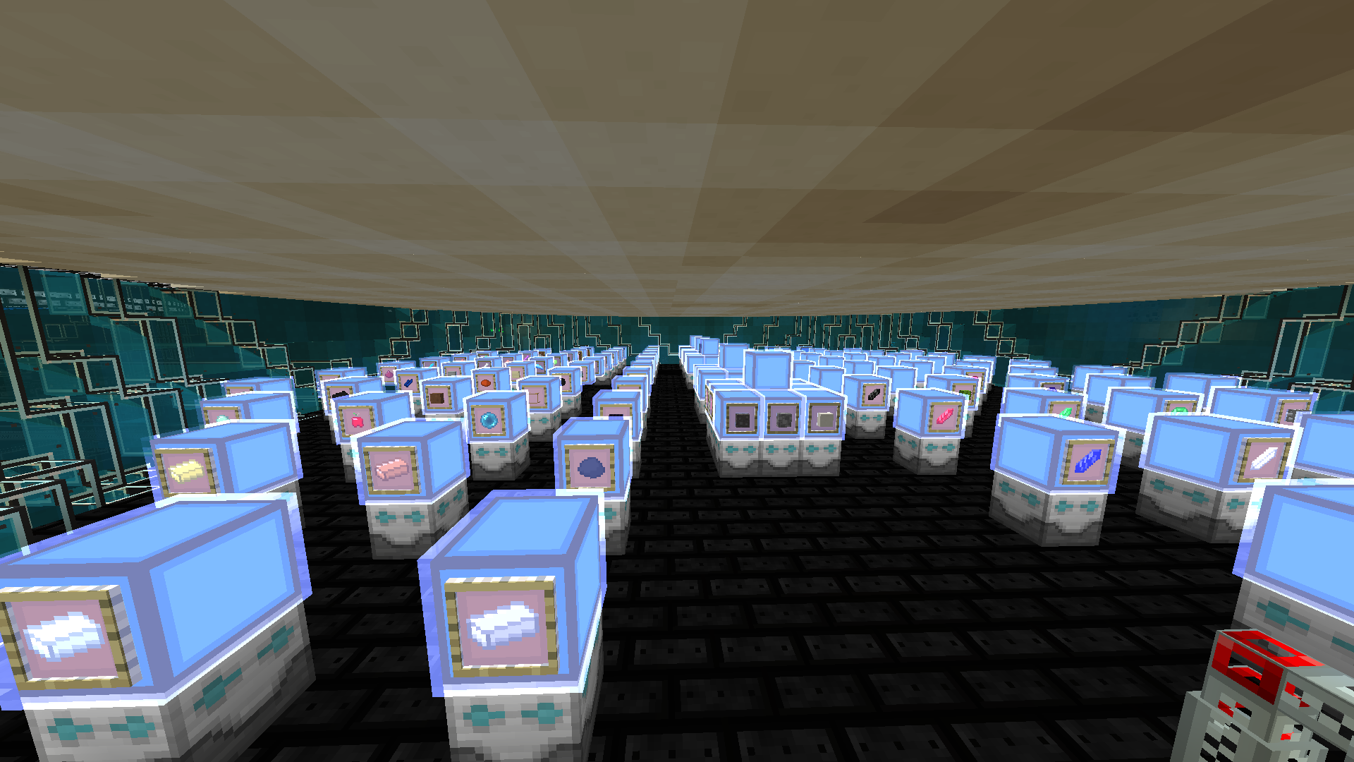 Here are the system I am planing to build. The first two images are my storage facility, most items are being stored in barrels, and larger quantities in drives. Simply because it looks good, now this is only the storage room. I will rarely be in this room and crafting, processing and so forth is done elsewhere. My goal is to have about 16 of these islands.