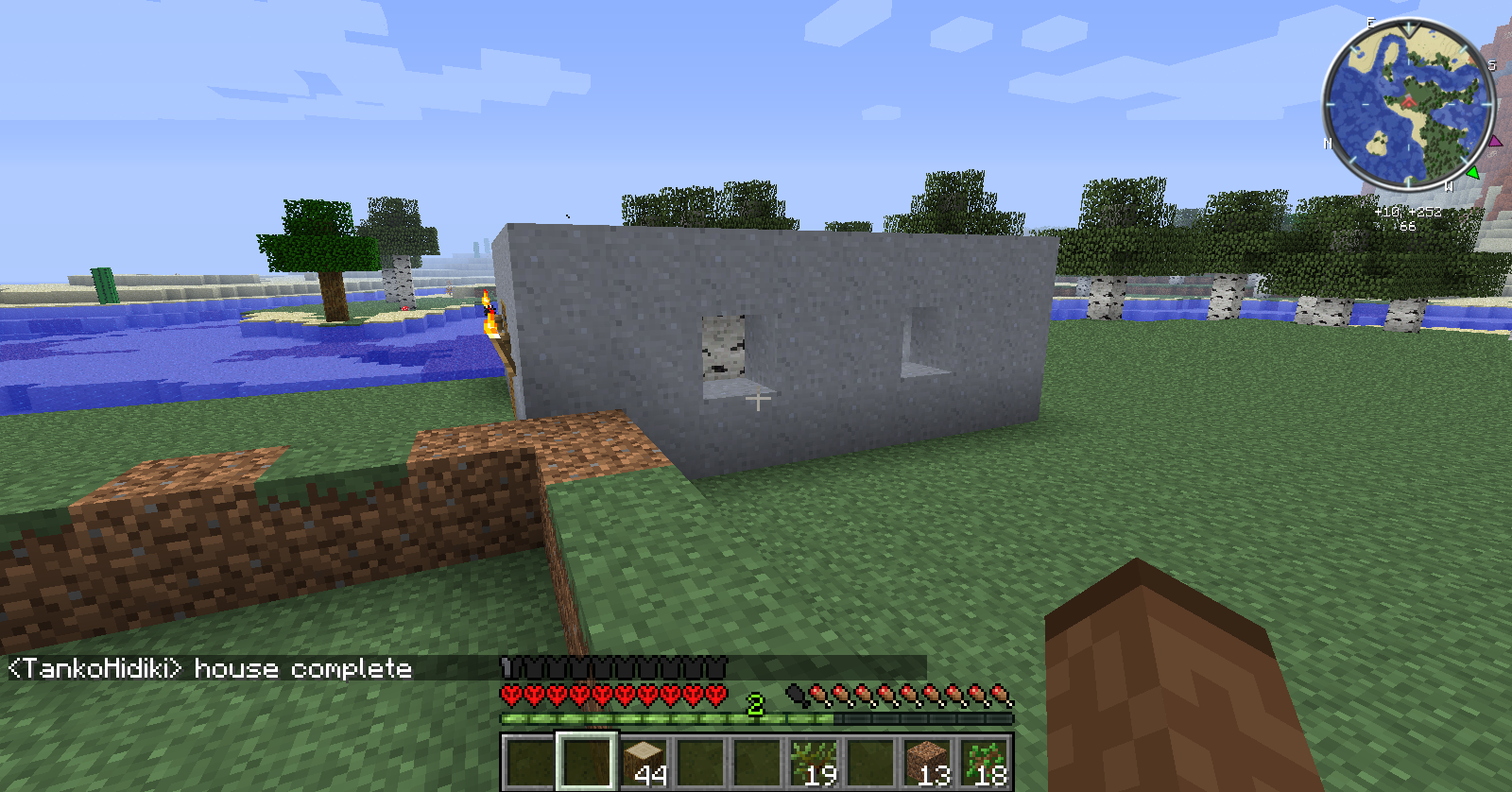 I came up with a chimney to light myself up during the hovel stage. It was crazy, like a 4-tall, displaced in a diamond-like format, group of dirt collumns with slabs on the top.