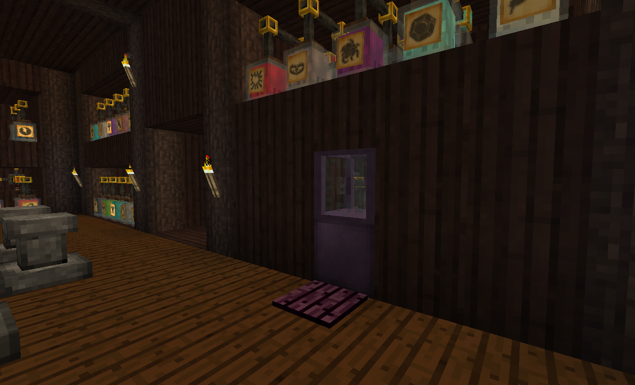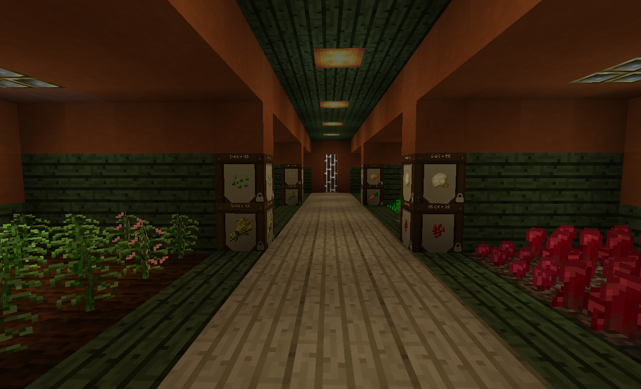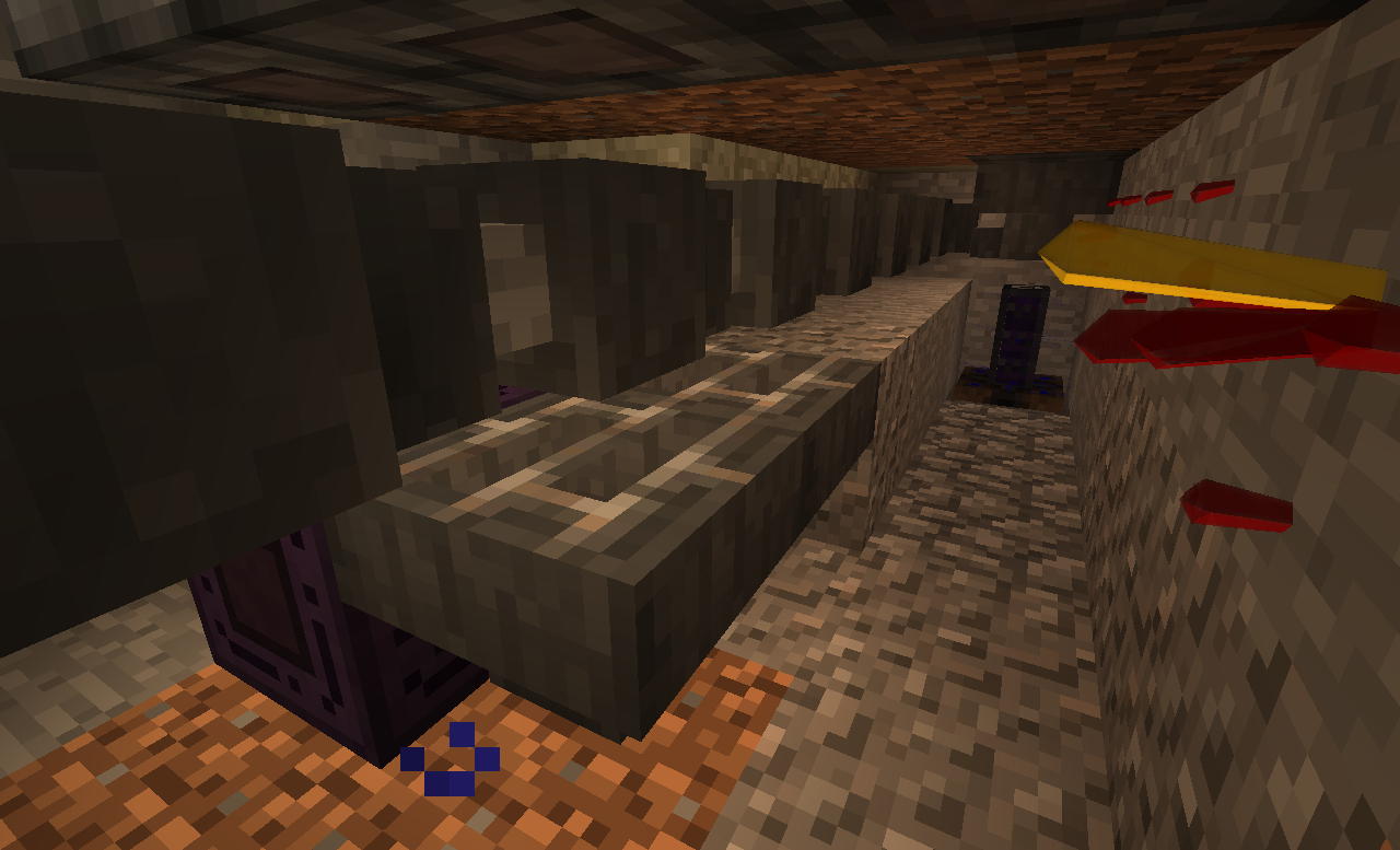 Heres another update on my base. First an overview of the main hall which has changed a bit from last time. Angled the pics so you can see where each room is located. I know its a bit weird that each room is so different but I like the variety. So far this is the least laggy build Ive ever done. Living underground allows me the option to turn the view distance way down. I cant figure out a good way to do doors in here though. I dont like trying to squeeze through single doors and double doors are out of the question because symmetry. Advanced drawbridges crash my game as does Malis's doors.