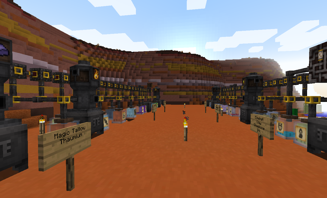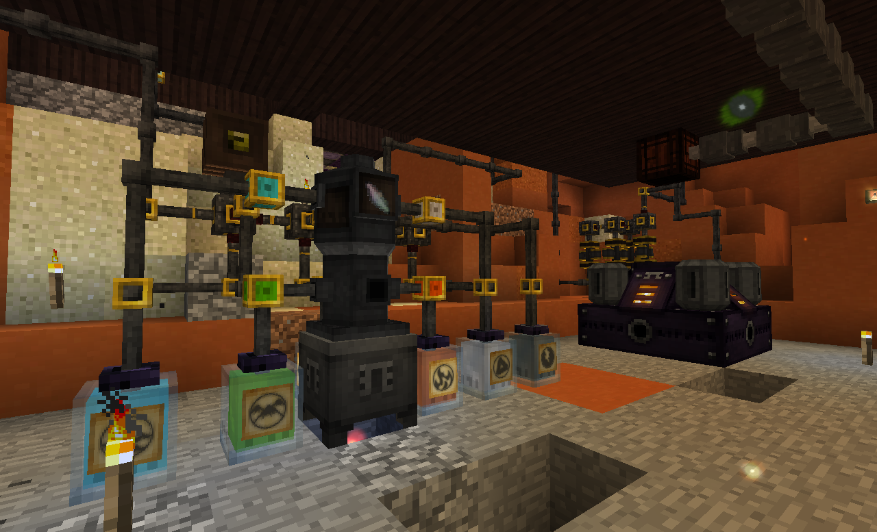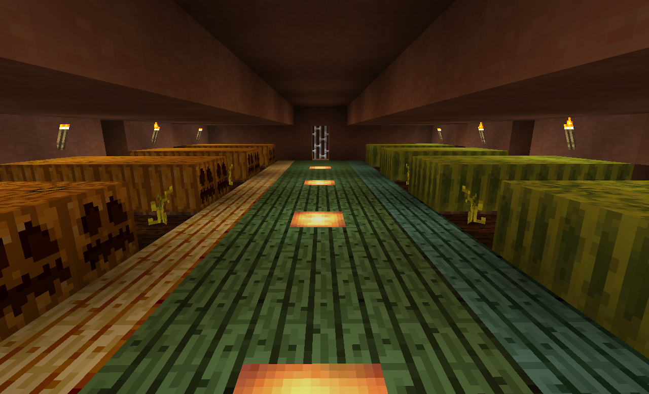 I really like like the design of the walls and floor.I finally finished the farms I was working on earlier (3 posts up) I converted the farms over to a manual cutoff, and now have the overflow being fed directly into my alchemical furnace at the moment. Only excess farm drops get sent to the alchemical furnace. Random stuff gets sent to a chest instead. (I would really hate it to have my nicely enchanted gear sent to an alchemical furnace accidentally.) When I get a little further along in botania, the food drops will be converted into mana instead. The melon and pumpkin farms are directly above the other farms.