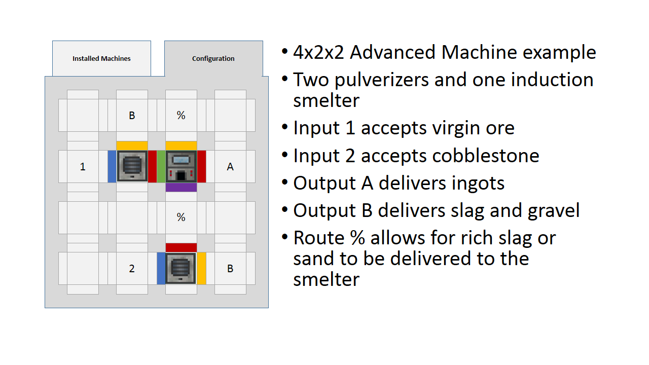 Anyway, the idea is a new block for TE that is an advanced machinery block that is combined in multiples of two in both Height, Width, and Length. So a series of advanced machinery blocks in a 4x2x2 configuration forms an advanced machine. This machine has the typical TE GUI, but allows the user to layout machines internally. Its capacity is determined by the number of blocks used to build it. In the case of 4x2x2, the advanced machine has 16 slots in a 4x4 grid. Input and output to the advanced machine is done in similar fashion as the colors of TE machines, but rather utilizes numbers for inputs and letters for outputs. Special characters are internal routes.